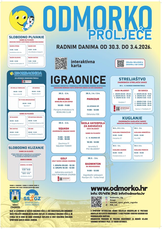 Školski sportski savez Grada Zagreba tijekom proljetnoga odmora učenika od 30. ožujka do 3. travnja 2026. godine organizira program Odmorko proljeće.